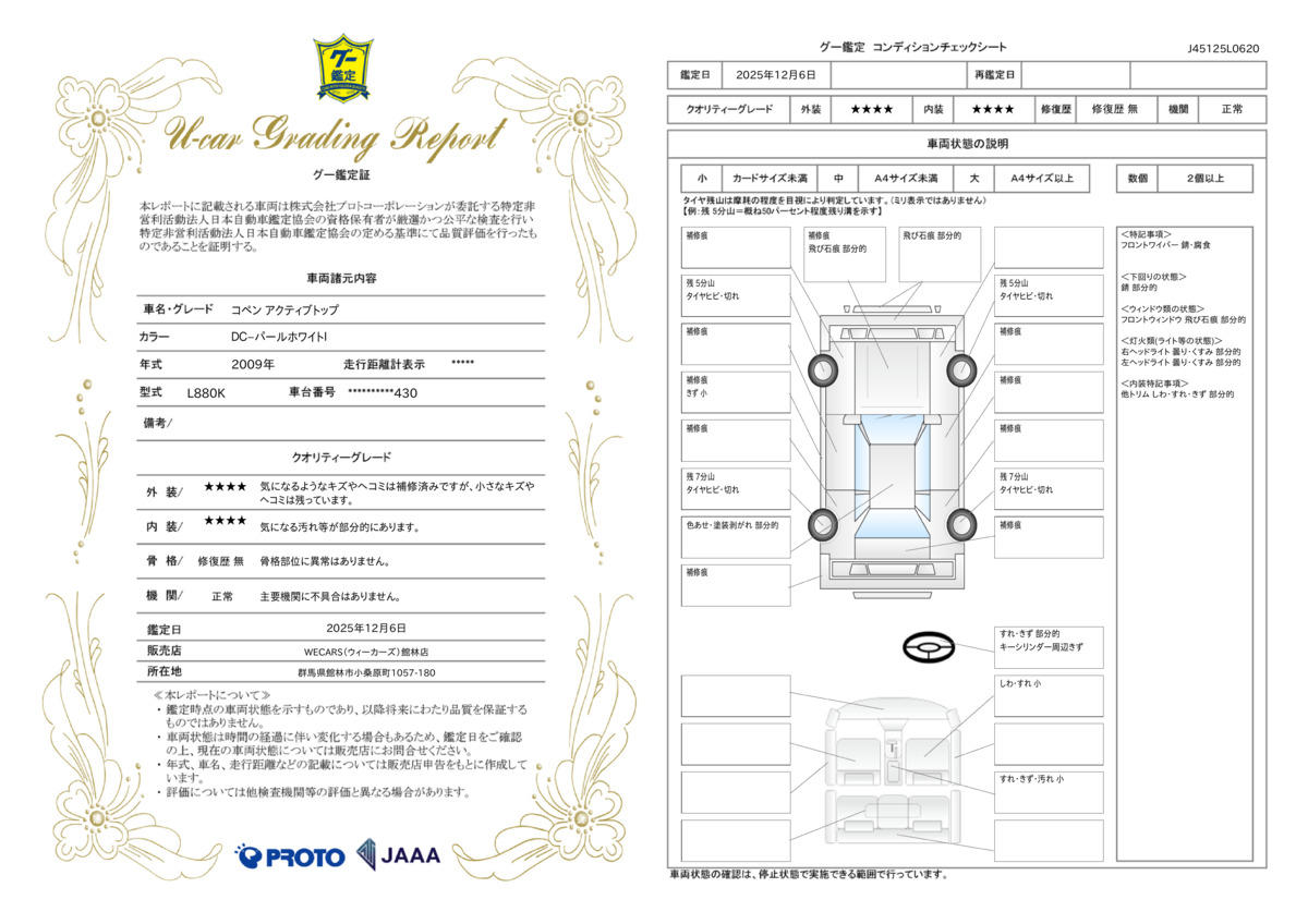 | 内容 | 納車後1ヶ月・1000km以内は36機構・343項目を保証いたします。詳しくは販売店までお問い合わせ下さい。 |