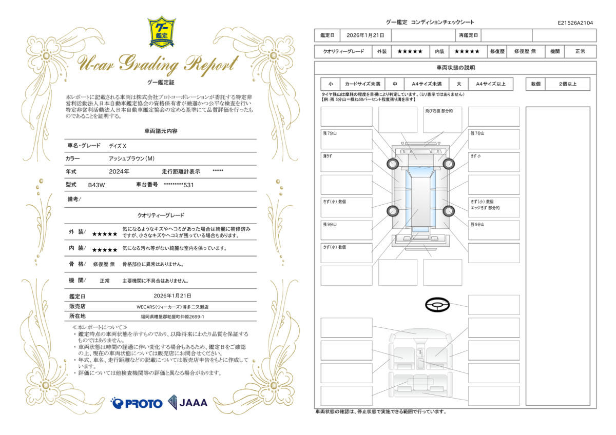 | 内容 | 納車後1カ月・1000km無料保証!さらに、選べるWE!保証(1・3・5年プラン)もご用意。最大36機構・343項目対応、全国240店舗で安心サポート! |
