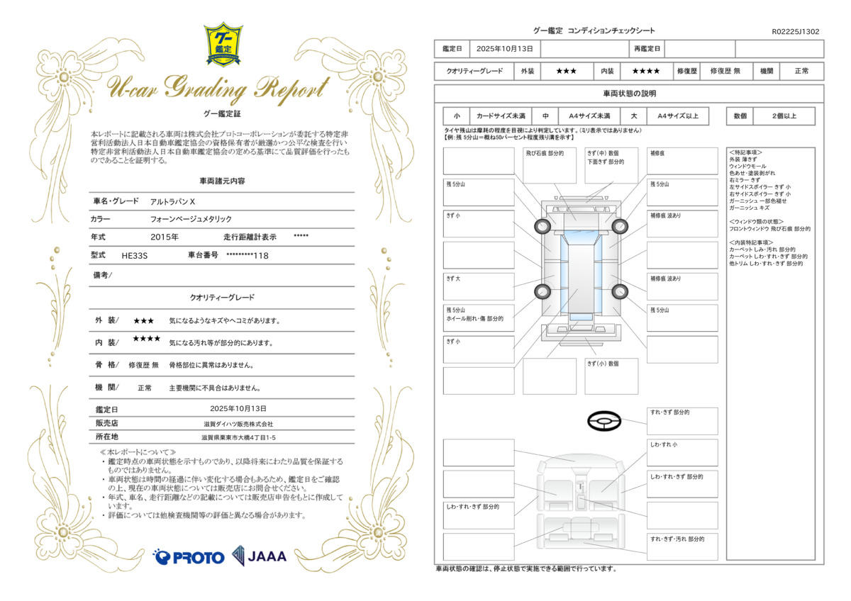 クルマの状態と評価点数を開示し、図解で表示いたしております。車両状態検査書はこちらの車両ページで閲覧できます。(※一部評価書が未設置の車両がある場合がございます)