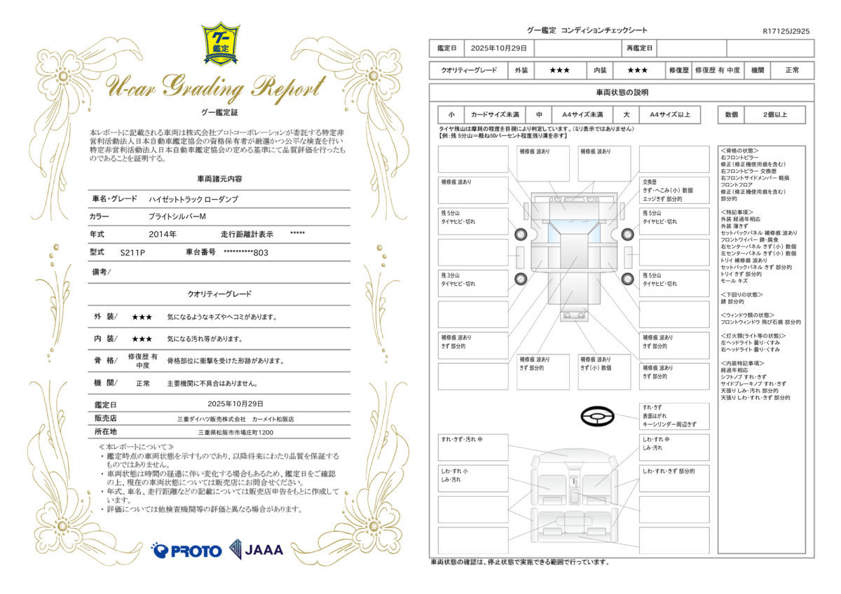 一般財団法人 日本自動車査定協会の車両状態証明書となります。