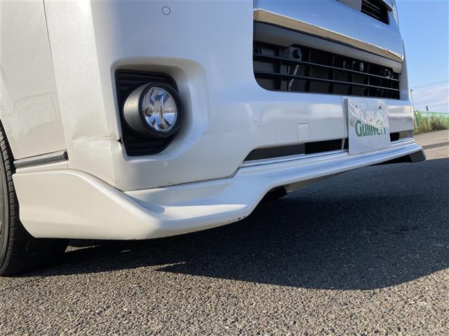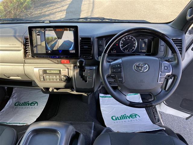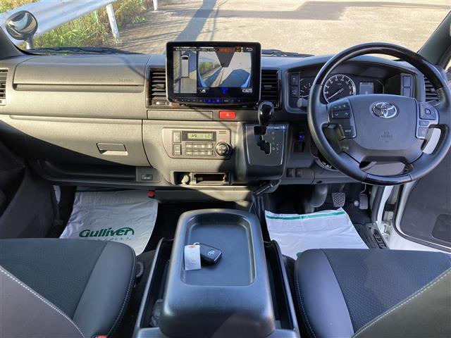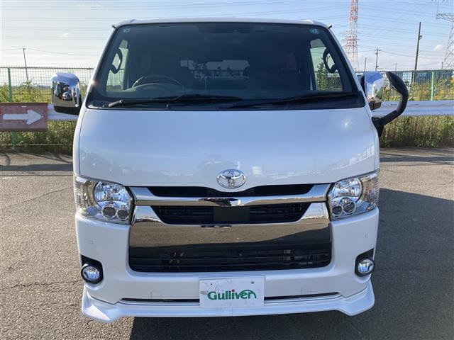 トヨタ ハイエースバンスーパーGL ダーク プライムII 禁煙車 全方位モニタ 衝突被害軽減 車線逸脱防止 IC付ターボ LEDオートライト 社外11型ナビ 両側パワスラ ビルトインETC 社外後席用フリップダウンモニタ ハーフレザーシート フロントエアロ