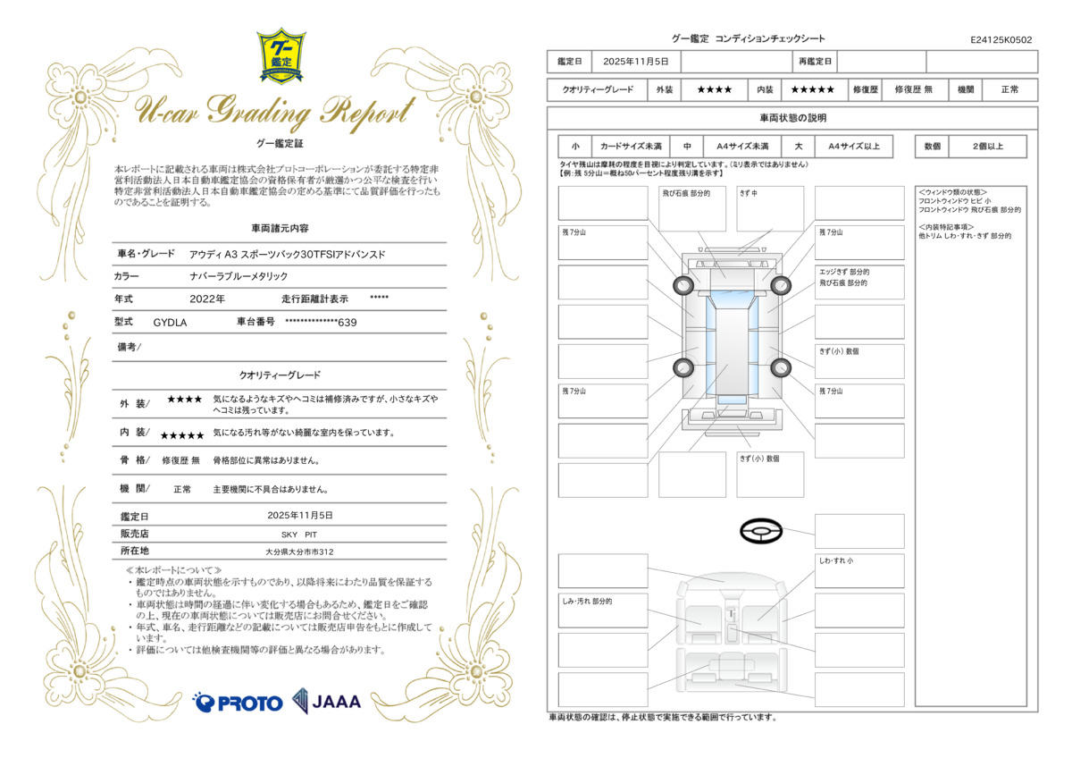 第三者機関より車輛品質評価の検査を受けております。検査は有料のため全販売店が行っているわけではございません。SKYPITではお客様一人一人がより安心してご検討を頂けるよう出来る限りの努力をいたします。