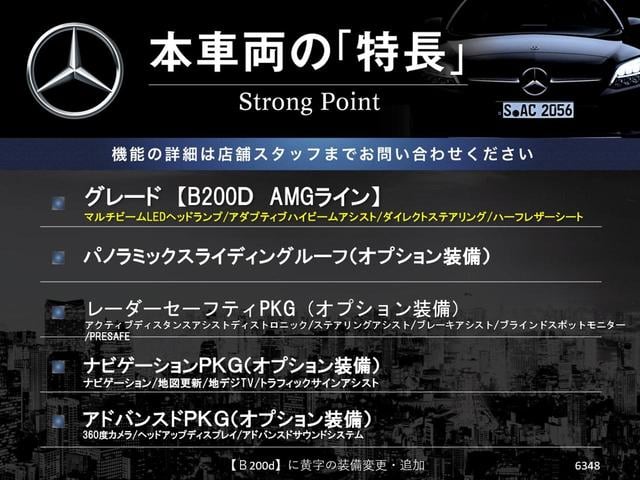メルセデス・ベンツ BクラスB200d AMGライン パノラミックスライディングルーフ レーダーセーフティPKG ナビゲーションPKG アドバンスドPKG アンビエントライト ハーフレザーシート フットトランクオープナー プライバシーガラス 禁煙車