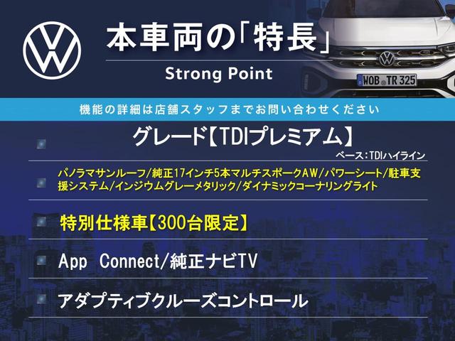 TDI プレミアム 200台限定 パノラマサンルーフ 純正ナビTV App Connect バックカメラ アダプティブクルーズ パワーシート 駐車支援システム 電動リアゲート 純正17インチ5本マルチスポークAW ETC