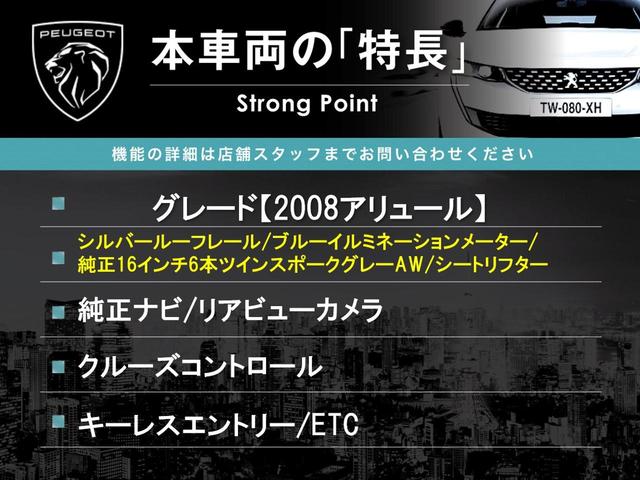 プジョー 2008アリュール 1オーナー 純正ナビTV バックカメラ 純正16インチ6本ツインスポークAW クルーズコントロール オートライト デュアルエアコン オートエアコン パーキングアシスト プライバシーガラス ETC