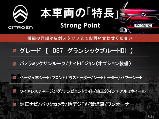 DSオートモビル DS7クロスバックグランシック ブルーHDi パノラミックサンルーフ ナイトビジョン ワンオーナー 革シート フロントガラスヒーター アンビエントライト ワイヤレスチャージング 前席シートヒーター 前席パワーシート 電動リアゲート 禁煙車