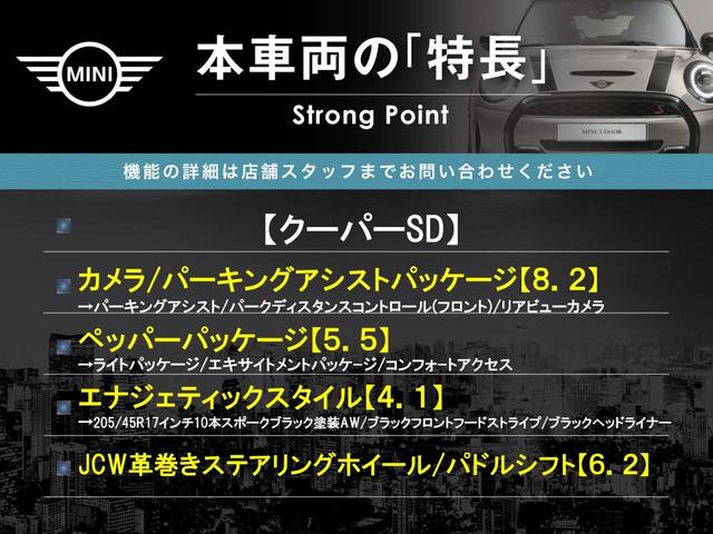 MINI MINIクーパーSD 3ドア カメラ/パーキングアシストPKG ペッパーPKG エナジェティックスタイル JCW革巻きステアリングホイール 純正ナビ バックカメラ アクティブクルコン LEDヘッド ETC 禁煙車