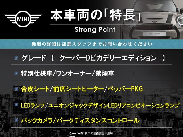 MINI MINIクーパーD ピカデリーエディション 特別仕様車 ワンオーナー 純正ナビ バックカメラ LEDヘッドランプ 合皮シート 前席シートヒーター ペッパーPKG パークディスタンスコントロール ユニオンジャックデザインランプ 禁煙車