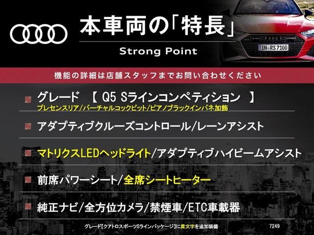 アウディ Q5Sライン コンペティション アダプティブクルーズコントロール レーンアシスト クリアランスソナー アダプティブハイビームアシスト マトリクスLEDヘッドランプ 純正ナビ 全方位カメラ 全席シートヒーター 前席パワーシート ETC