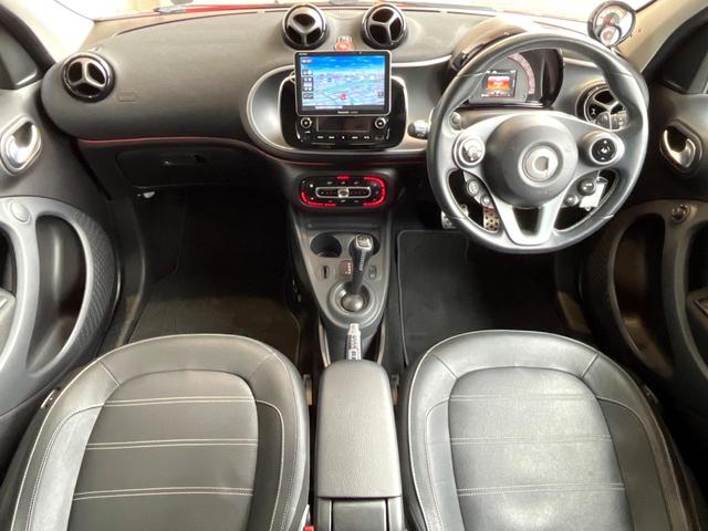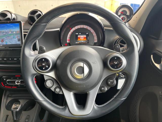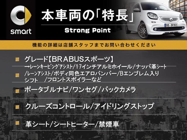 スマート スマートフォーフォーBRABUS スポーツ ガラスルーフ フローティングナビ ワンセグ バックカメラ 黒革シート シートヒーター クルコン クリアランスソナー パドルシフト アイドリングストップ 純正17インチアルミホイール ETC 禁煙車