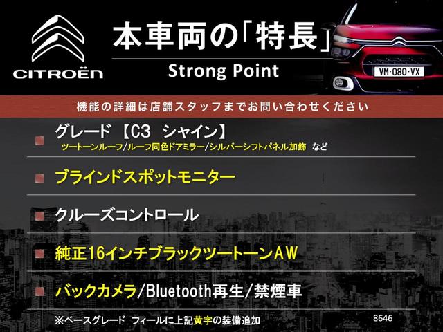 シトロエン C3シャイン クルーズコントロール ブラインドスポット LEDヘッドランプ オートライト 純正16インチアルミ ツートーンルーフ Bluetooth再生 禁煙車