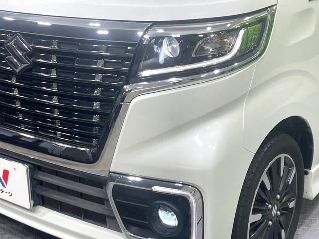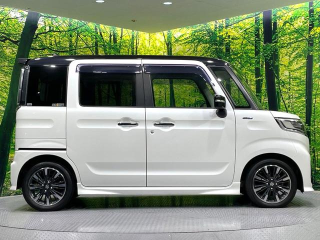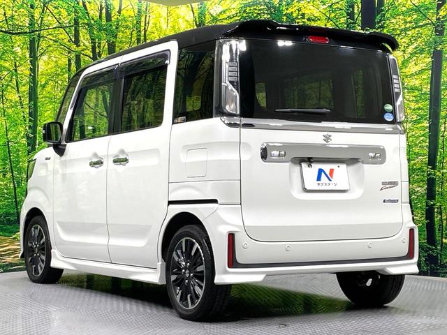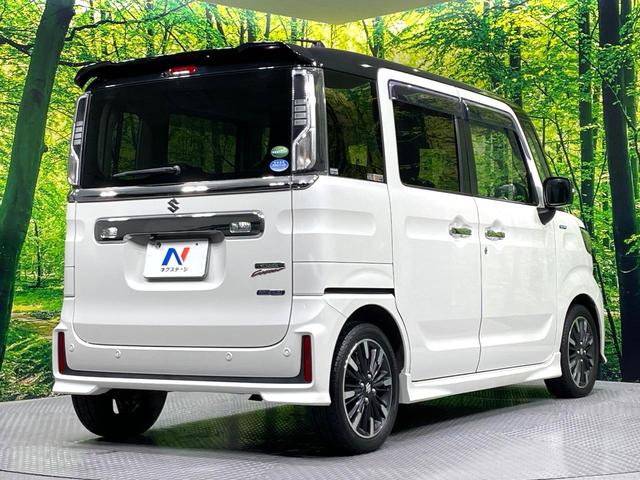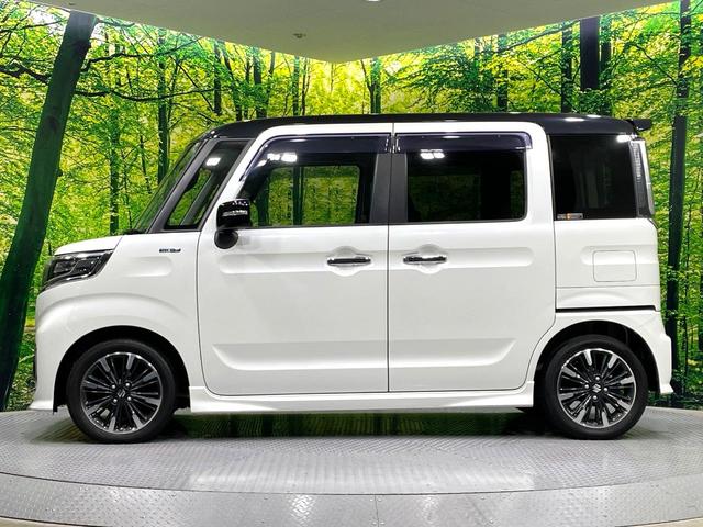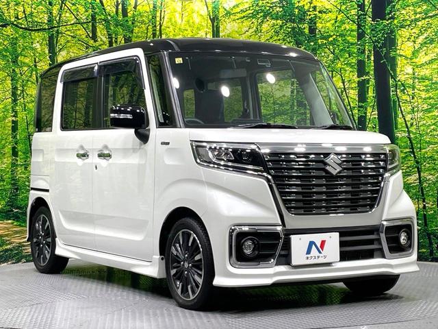スズキ スペーシアカスタムハイブリッドXSターボ 禁煙車 両側電動ドア バックカメラ 8インチナビ 衝突被害軽減システム ハーフレザーシート シートヒーター コーナーセンサー スマートキー LEDヘッド ETC クルコン 純正15インチアルミ