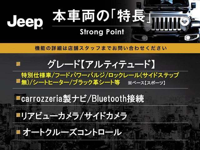 クライスラー・ジープ ジープ・ラングラーアンリミテッドサハラ アルティテュード 黒革シート carrozzeria製ナビ バックカメラ シートヒーター クルーズコントロール フードパワーバルジ 純正18インチアルミ オートライト ブラックフューエルフィラードア