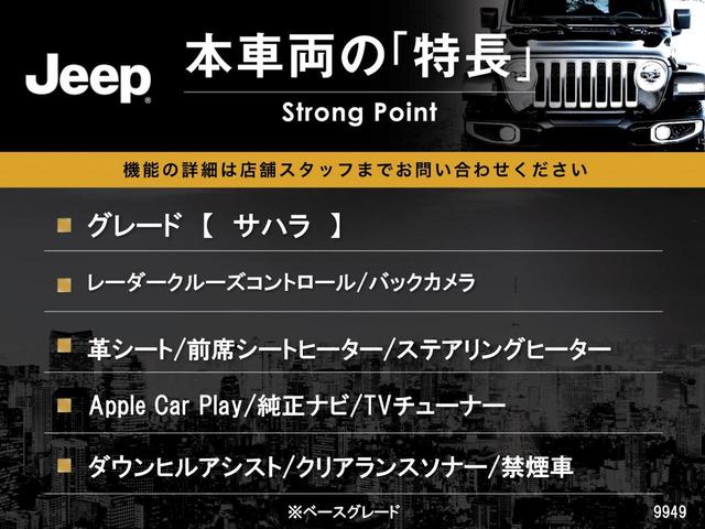 クライスラー・ジープ ジープ・ラングラーアンリミテッドサハラ Apple Car Play 革シート 前席シートヒーター ステアリングヒーター レーダークルーズコントロール LEDヘッドランプ オートハイビーム 180度カメラ 純正ナビ TVチューナー 禁煙車