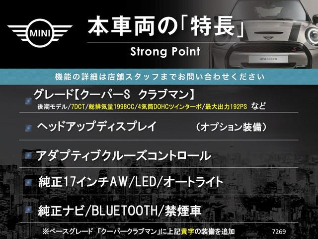 MINI MINIクーパーS クラブマン 後期モデル ヘッドアップディスプレイ アダプティブクルーズコントロール LED 純正17インチアルミ バックカメラ オートライト Bluetooth再生 禁煙車