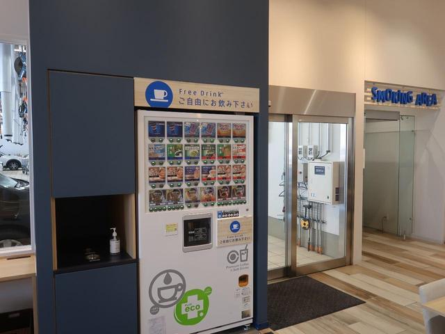 広くて明るいショールーム。整備でお待ちいただく時間も快適です。無料ドリンクや雑誌も完備♪