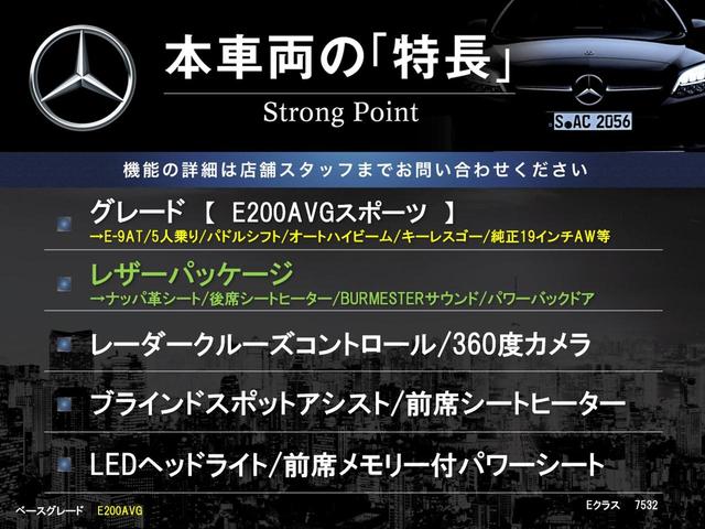 メルセデス・ベンツ EクラスE200 アバンギャルド スポーツ レザーPKG レーダークルーズコントロール 360度カメラ ブラインドスポットアシスト 黒革シート 全席シートヒーター 前席メモリー付パワーシート LEDヘッドライト レーンアシスト 純正ナビ 禁煙車