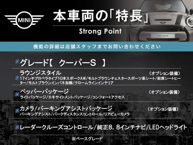 MINI MINIクーパーS 5ドア ペッパーPKG カメラ/パーキングアシストPKG ラウンジスタイル 前席シートヒーター レーダークルーズコントロール 純正8インチナビ LEDヘッドライト オートライト 純正17インチAW