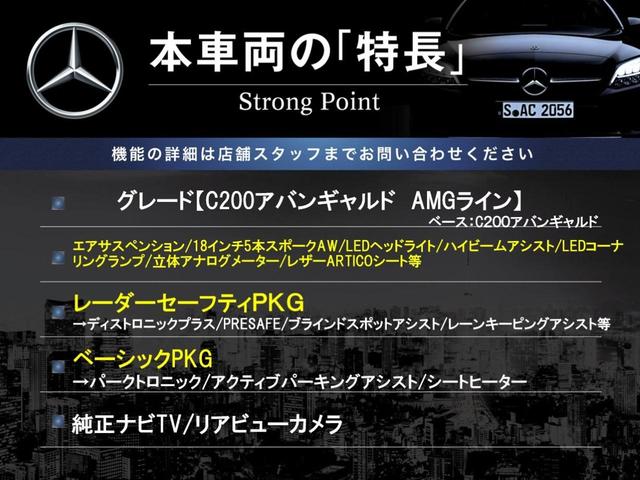 C200アバンギャルド AMGライン レーダーセーフティPKG ベーシックPKG 黒革シート 純正ナビTV リアビューカメラ キーレスゴー パワーシート LEDヘッドライト ハイビームアシスト 純正18インチアルミ ETC 禁煙車