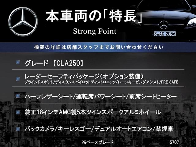 メルセデス・ベンツ CLAクラスCLA250 レーダーセーフティパッケージ レーダークルーズコントロール ブラインドスポット ハーフレザーシート 前席パワーシート 前席シートヒーター キーレスゴー バックカメラ 禁煙車