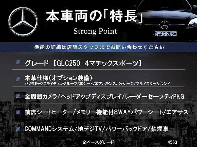GLC250 4マチックスポーツ(本革仕様) 本革仕様 サンルーフ 全周囲カメラ ヘッドアップディスプレイ パワーバックドア エアサス 純正19インチAW ブルメスターサウンド 前席シートヒーター メモリー機能付パワーシート 電動チルト 禁煙車