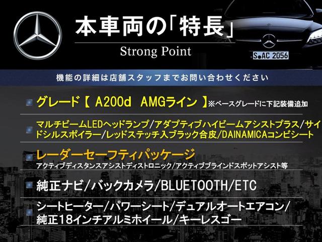 メルセデス・ベンツ AクラスA200d AMGライン レーダーセーフティパッケージ 純正ナビ バックカメラ LEDヘッドライト アダプティブハイビーム シートヒーター パワーシート 黒ハーフレザーシート キーレスゴー デュアルオートエアコン パドルシフト