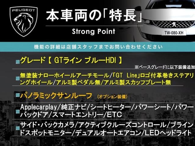 GTライン ブルーHDi パノラミックサンルーフ Applecarplay 純正ナビ サイド・バックカメラ アダプティブクルーズコントロール シートヒーター パワーシート 黒ハーフレザーシート デュアルオートエアコン ETC