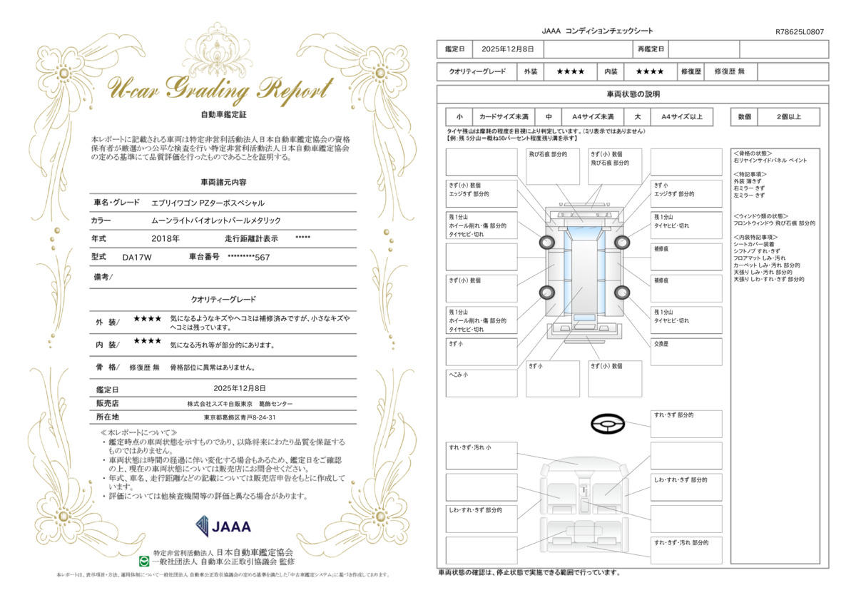 スズキが認定した検査員が、車両を検査し評価した、車両状態証明書付きの中古車です。内・外装、修復歴の有無を厳正にチェックし、車両状態を評価しています。