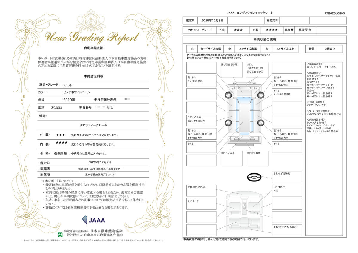 スズキが認定した検査員が、車両を検査し評価した、車両状態証明書付きの中古車です。内・外装、修復歴の有無を厳正にチェックし、車両状態を評価しています。