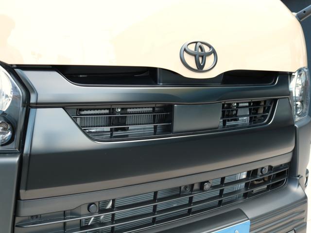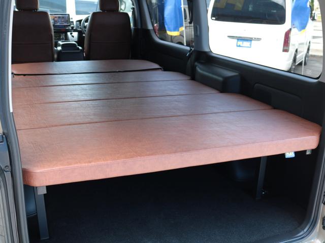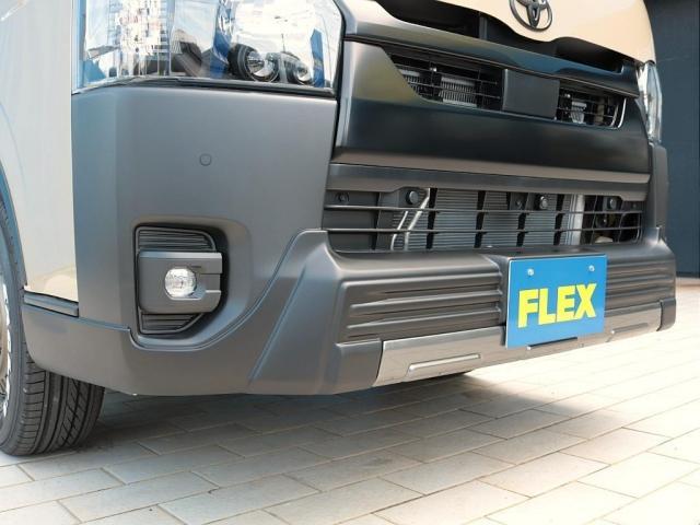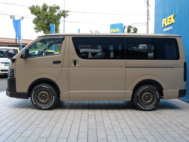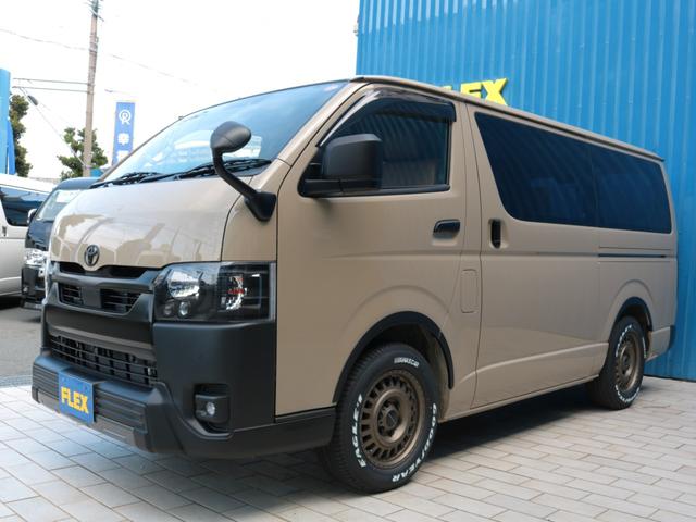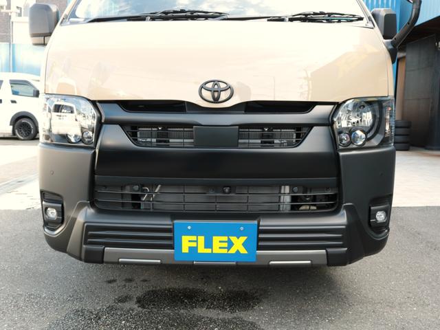 トヨタ ハイエースバンロングスーパーGL アースカラー FLEXブラックエディション Tフォーススポイラー ネクサスクレストAW オバフェン オメガテール クラシックレザーシートカバー ベッドキット アルパインフローティングナビ HDMI