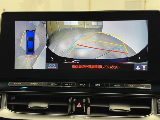 パノラミックビューモニターシステムが付いているので車の上から見た映像が確認できますよ。 一目で車両周辺の情報を確認できますが、直接安全をご確認下さい。