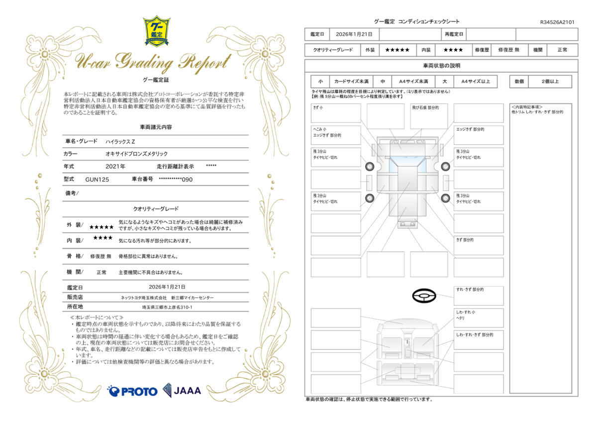 「グー鑑定車両」とは、第三者機関の日本自動車鑑定協会(JAAA)のプロの鑑定師が、外装・内装・機関・修復歴の4項目について鑑定を行った車両です。